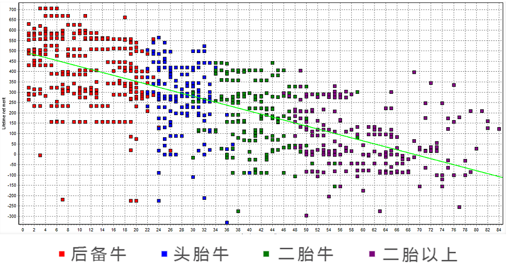上圖中橫坐標為月齡,縱坐標為遺傳效益指數,每個點代表一頭牛,不同顏色代表不同胎次牛。