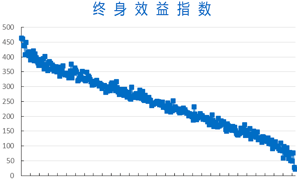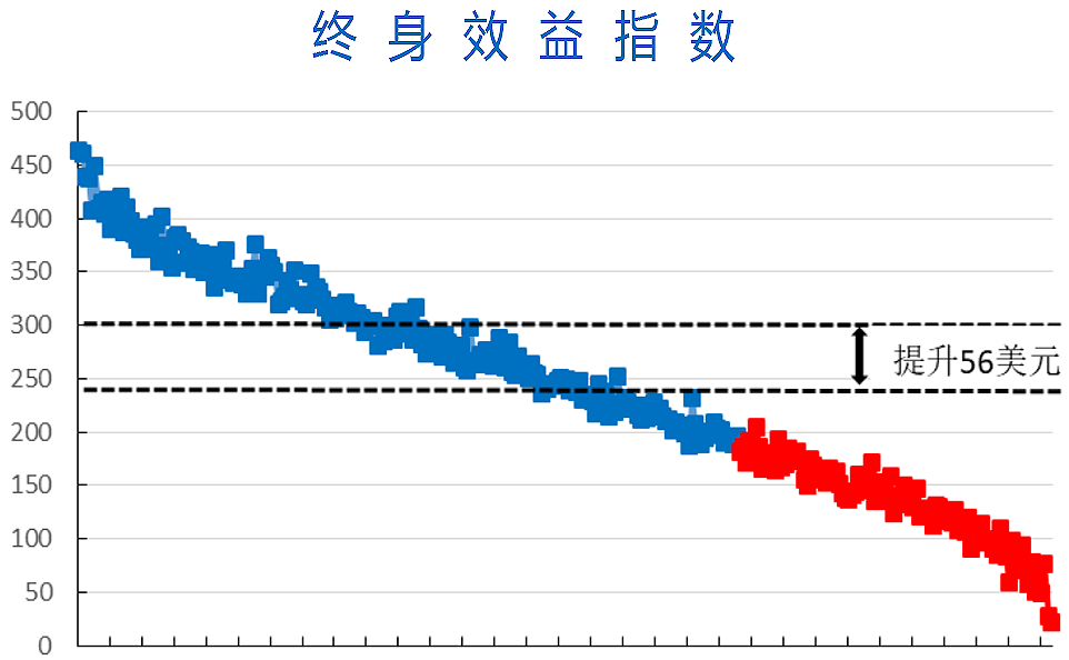 如下圖,將遺傳品質最差的100頭犢牛出售以后,剩下的犢牛平均終身效益指數能夠提升56美元,達到300美元,每頭牛將來能夠為牧場賺的錢更多。