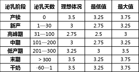 根據(jù)以上情況,賓州大學(xué)對(duì)泌乳牛各階段的體況評(píng)分推薦情況如下: